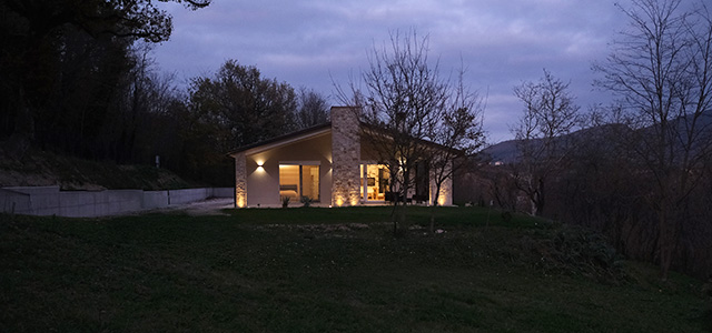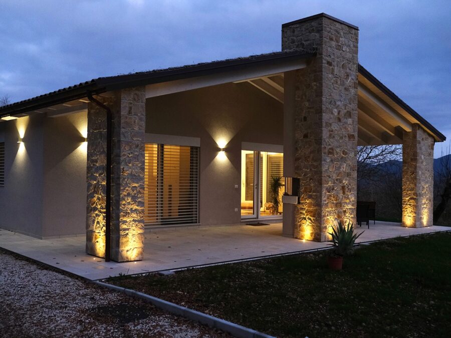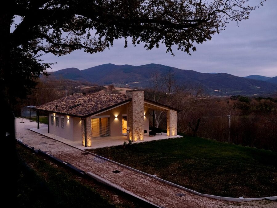 La casa si sviluppa su di un unico piano, per un totale di circa 100 mq di superficie interna, a cui si aggiungono 100 mq di porticato. Quest’ultimo, con le sue tre colonne rivestite in pietra locale, crea un legame profondo con il territorio, richiamando le antiche costruzioni rurali e valorizzando la bellezza del paesaggio circostante.