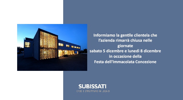 Informiamo la gentile clientela che l’azienda rimarrà chiusa nelle giornate di sabato 6 dicembre e lunedì 8 dicembre in occasione della Festa dell’Immacolata Concezione