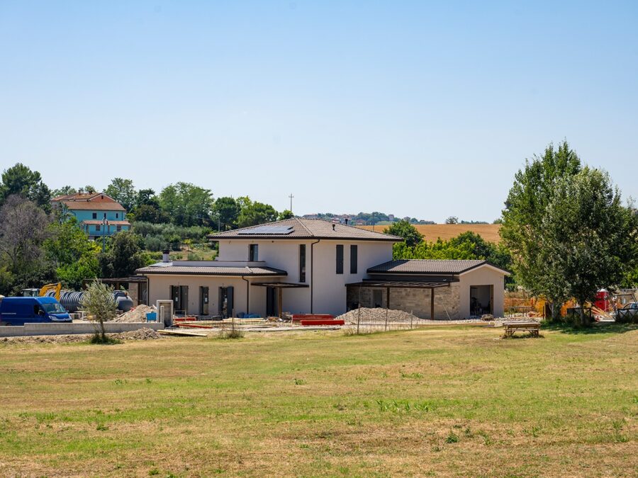 Siamo nelle fasi finali delle lavorazioni di una nuova villa bifamiliare in legno lamellare sita nel Comune di Montemarciano (AN).