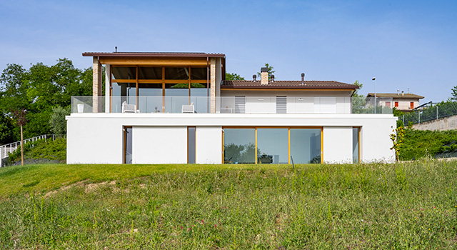 In a privileged position, the villa offers a wide panoramic view over the hills of the Marche region, making the most of the features of the land. The volumetry of the building consists of rectangular bodies surmounted by pitched roofs, with an entrance portico along the north-west front and a panoramic portico on the south-east side, incorporated into the roof.