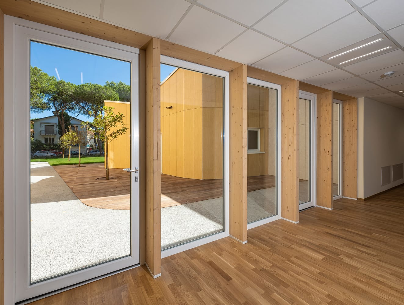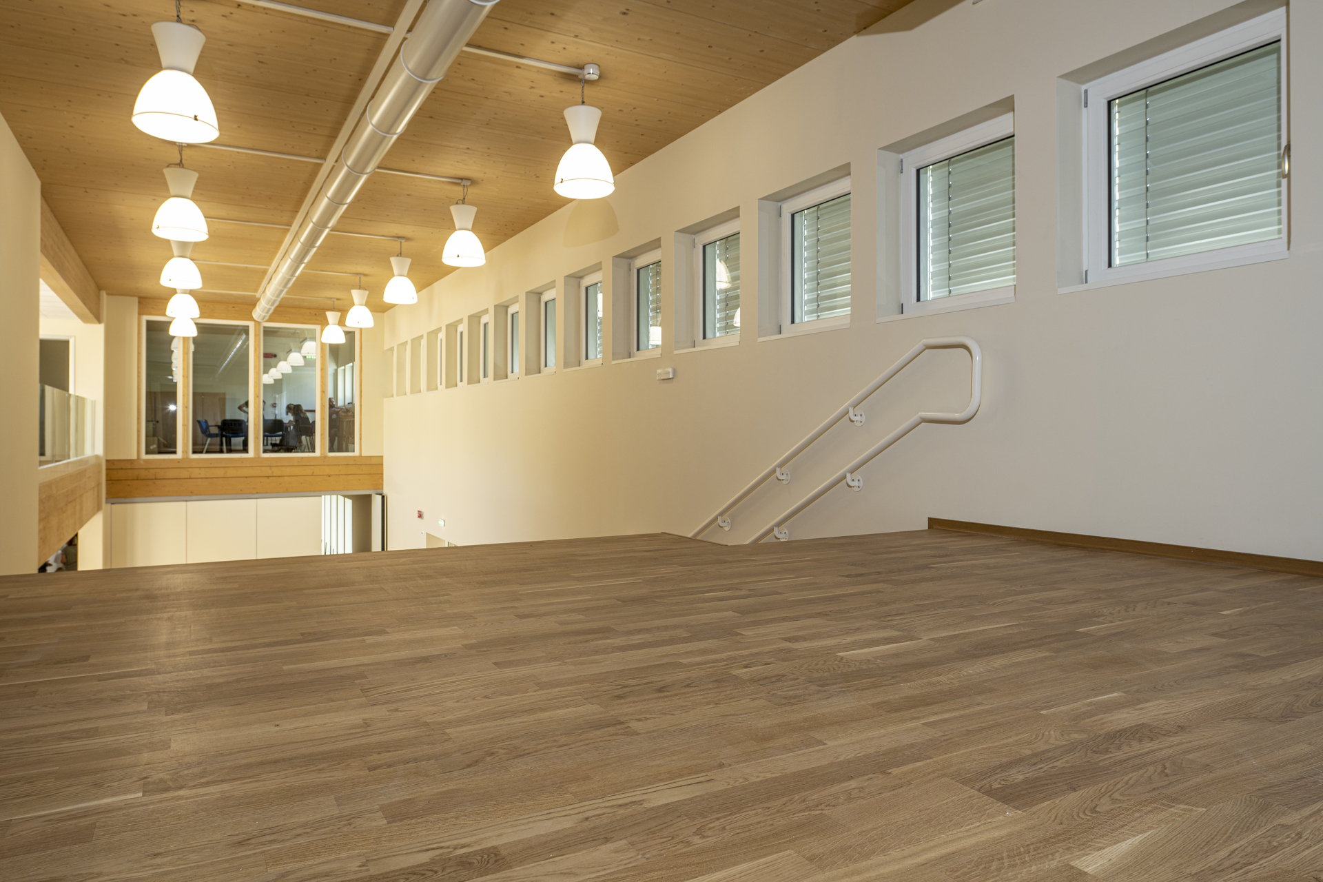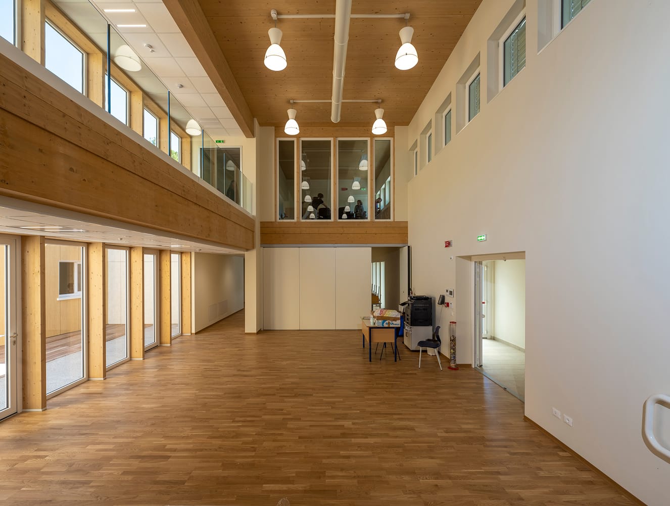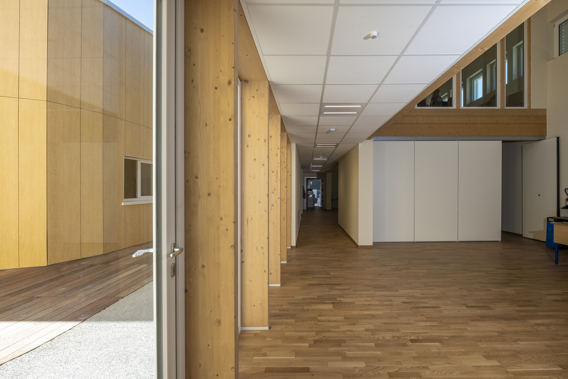 Gli spazi interni sono organizzati per favorire percorsi didattici fluidi, attività collettive e momenti di concentrazione, con aperture studiate per massimizzare luce naturale e connessioni visive con il contesto. Materiali e soluzioni costruttive sono scelti per garantire efficienza energetica, comfort termo-acustico e durabilità, mentre la composizione degli spazi accompagna in modo naturale i diversi usi della scuola.
