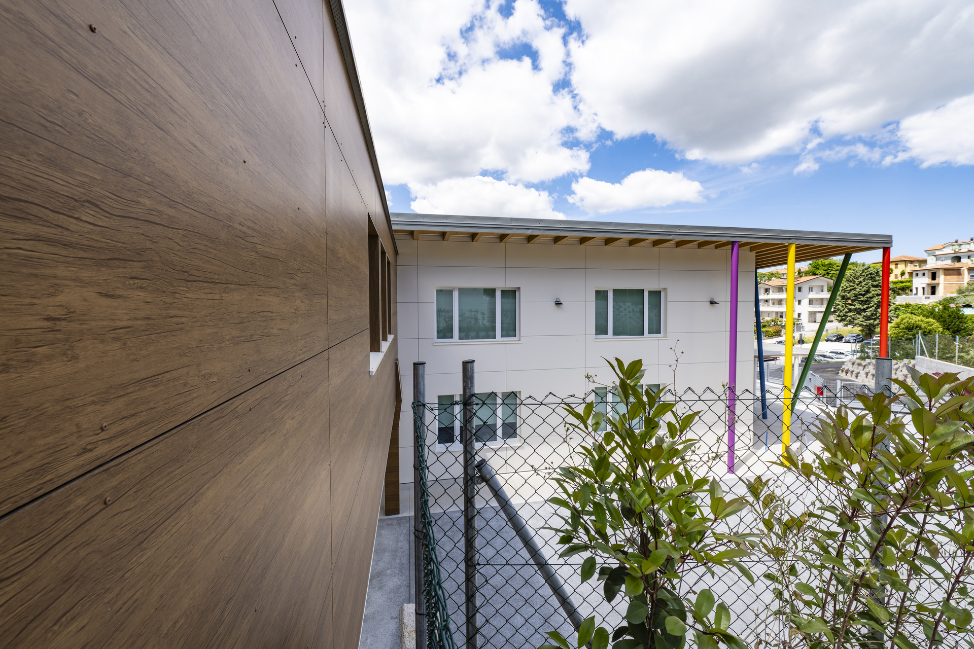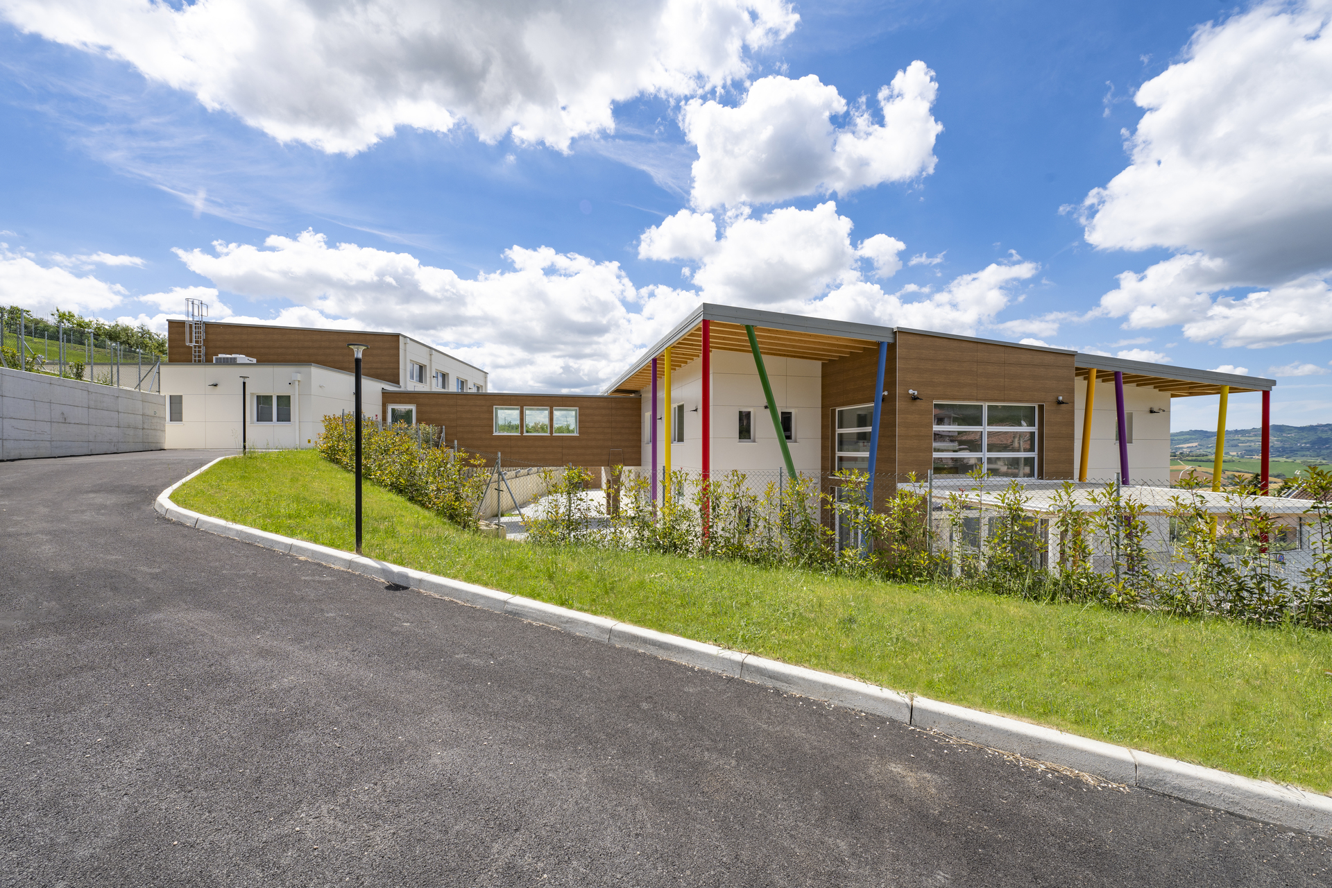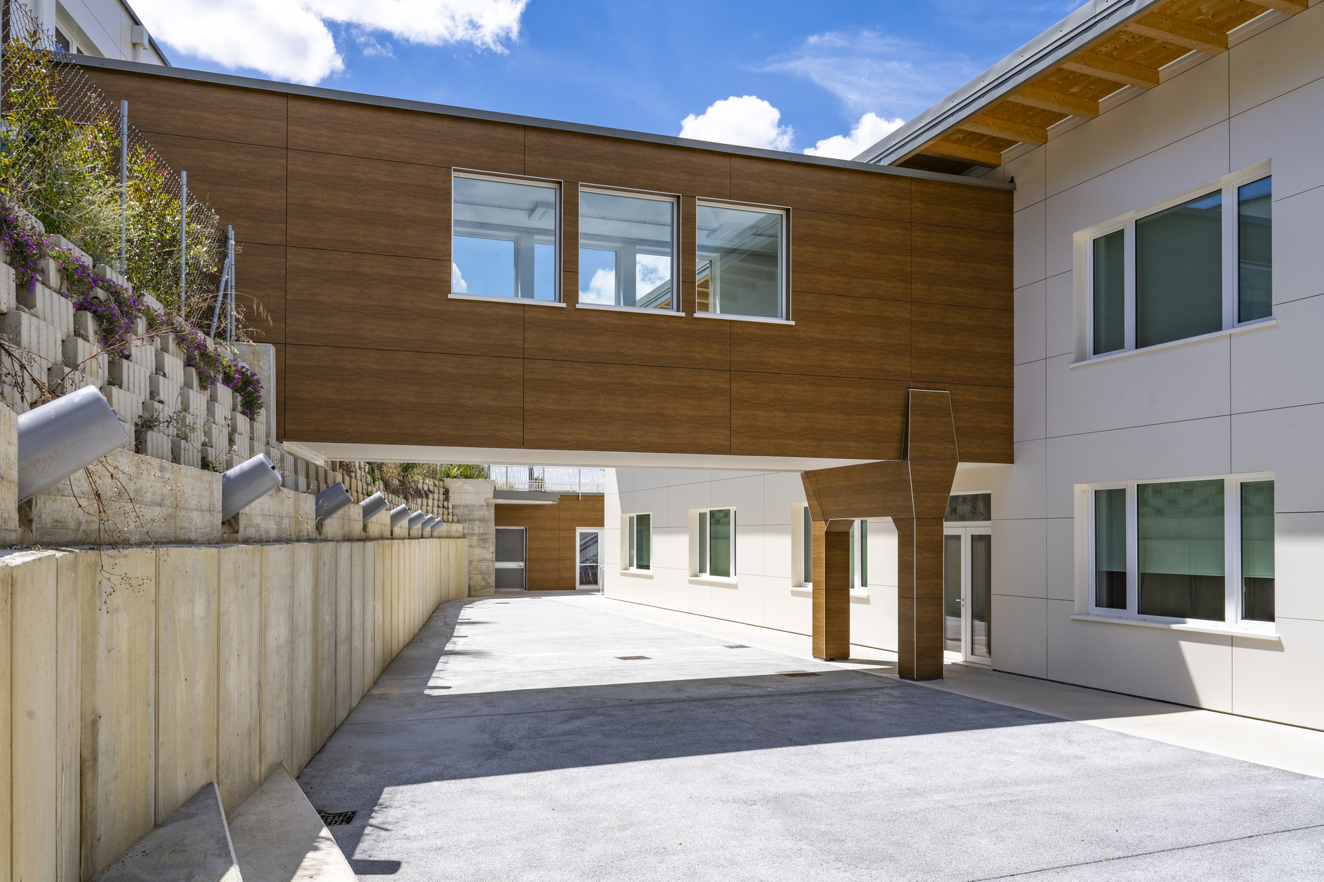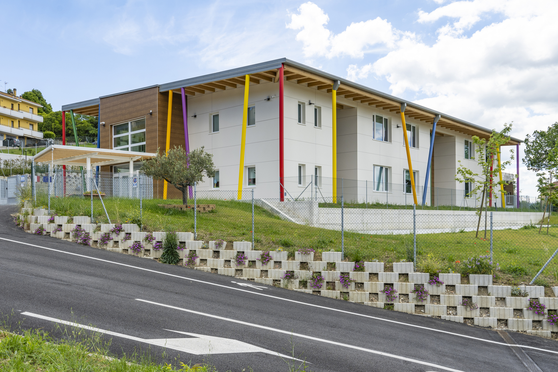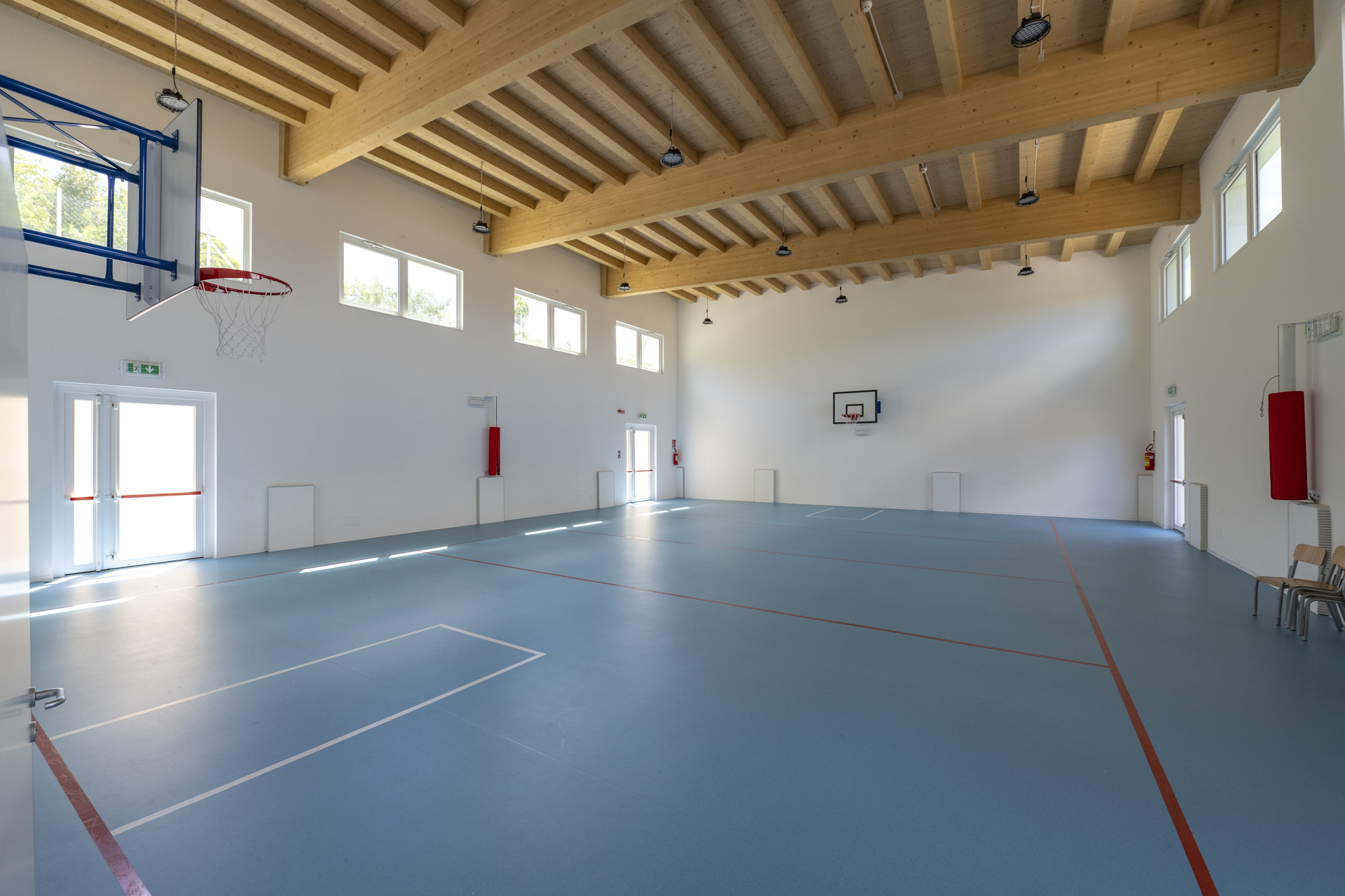 La struttura è caratterizzata da scelte costruttive orientate al risparmio energetico, al comfort interno e alla durabilità. Le ampie aperture favoriscono luce naturale e connessione visiva con l’esterno, mentre gli spazi interni sono distribuiti per facilitare relazioni, movimento e attività didattiche differenziate.