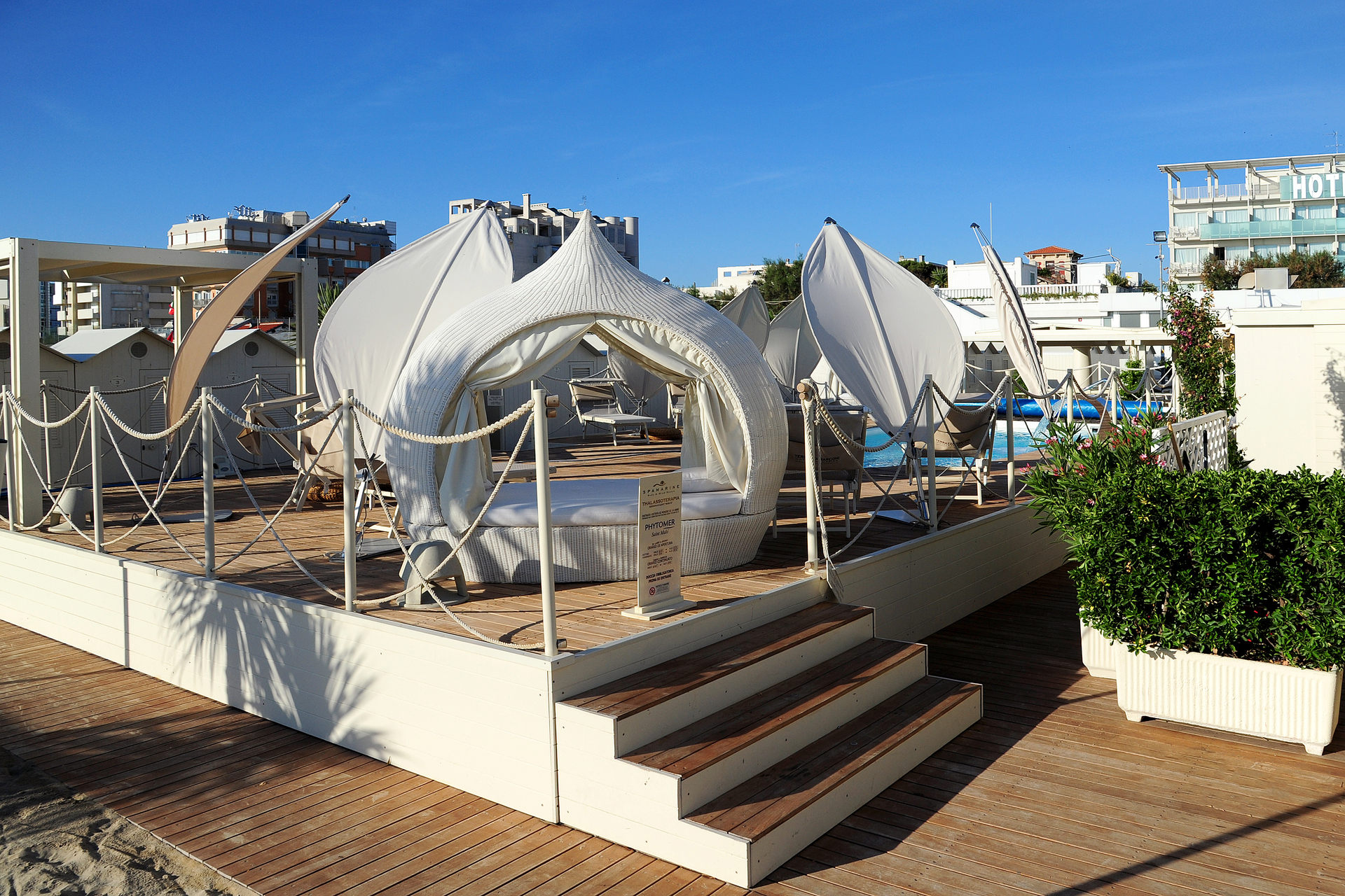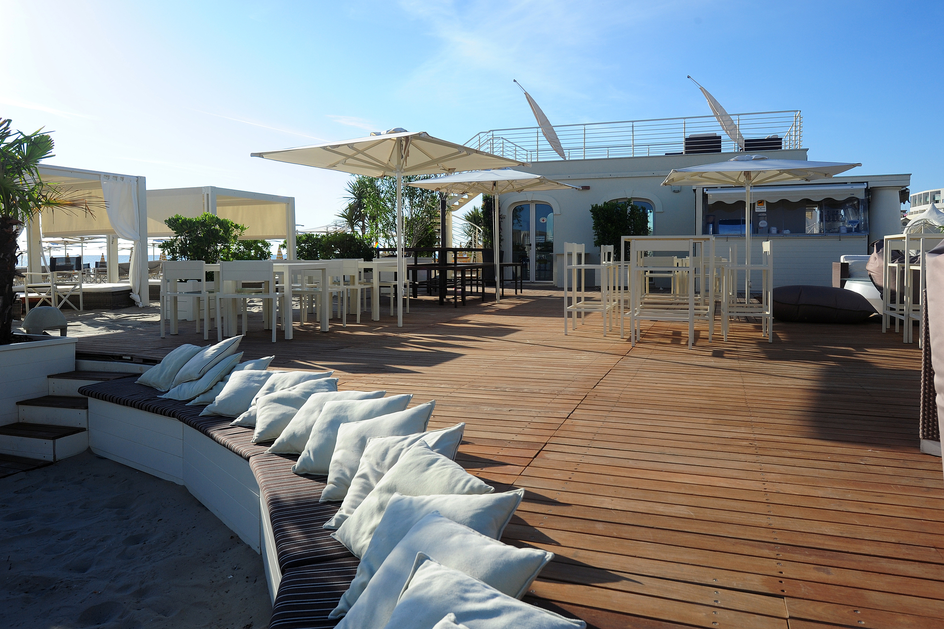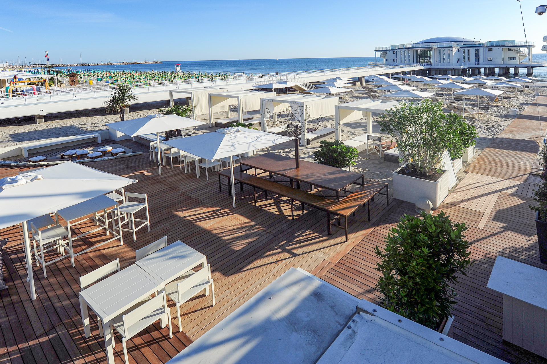 Stabilimento balneare composto da ristorante, caffetteria, strutture ombreggianti e cabine in legno