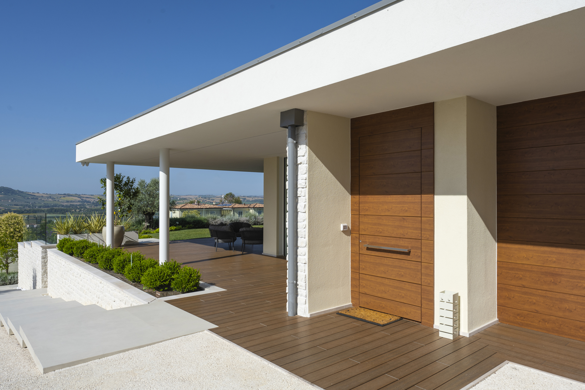 La configurazione spaziale privilegia la continuità tra interno ed esterno, con aperture studiate per valorizzare la luce naturale e creare connessioni visive con il paesaggio circostante.